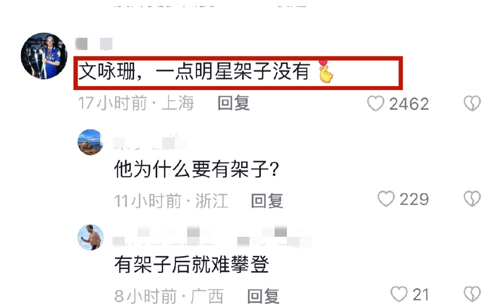 4月22号,有多位网友在视频账号上分享偶遇港星文咏珊的画面,并在留言处惊讶的表示:别人说这是明星,很多人卡卡拍照,可是站在我面前我也不认识,请问有人认识吗?