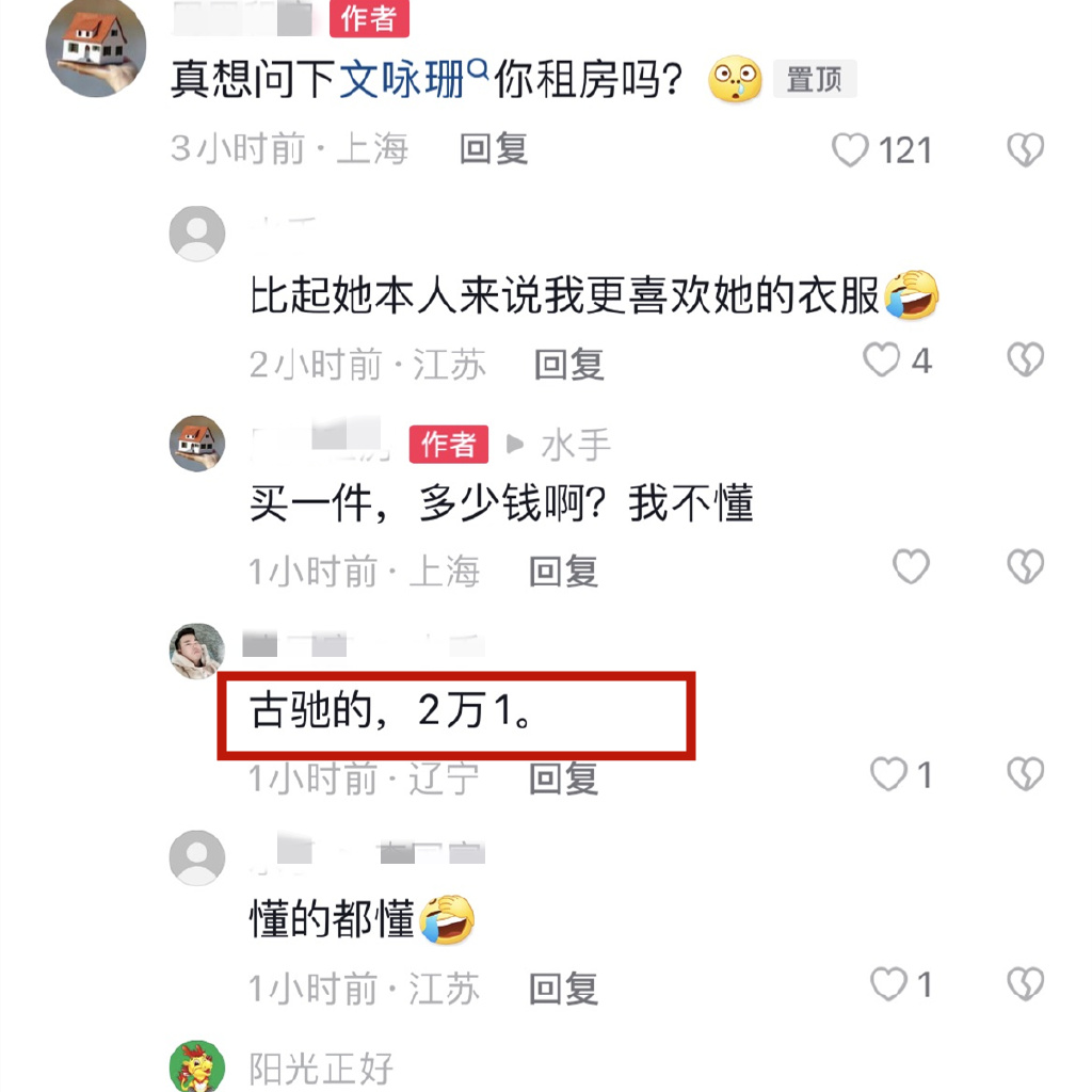 除此之外,文咏珊身上的着装也是引起了部分网友的热议,虽说在“行”方面不讲究,但在“穿”方面却非常讲究,据网友透露,她所穿的上衣价格为2.1万,所拎的包包价格在2万多。